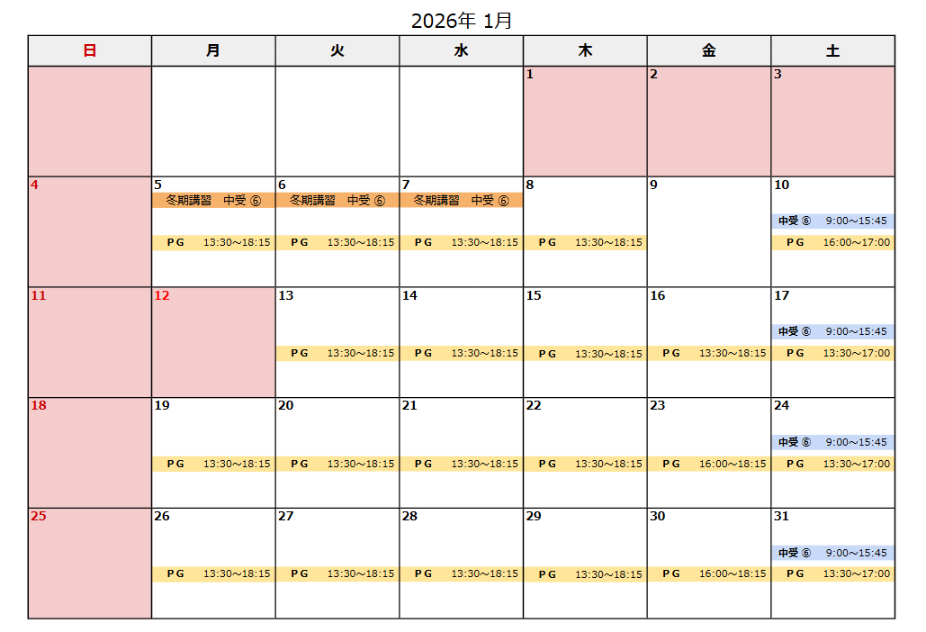 2025年11月~2026年1月の開講カレンダーを更新しました